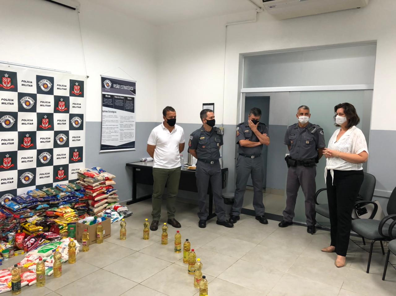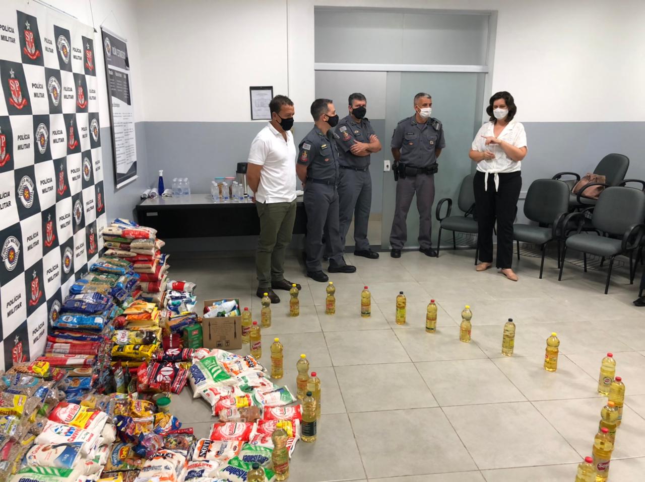 O comandante do 38º Batalhão da Polícia Militar do Interior (BPM/I), Tenente Coronel Otávio Augusto de Lima Seminate, repassou na tarde desta segunda para vice-prefeito Edson Ferraz e para a secretária de Cidadania e Assistência Social, Glaziela Solfa Marques, 520 kg de alimentos arrecadados durante a vacinação dos profissionais das forças de segurança pública que compõem a linha de frente na prestação de serviços essenciais à população.
