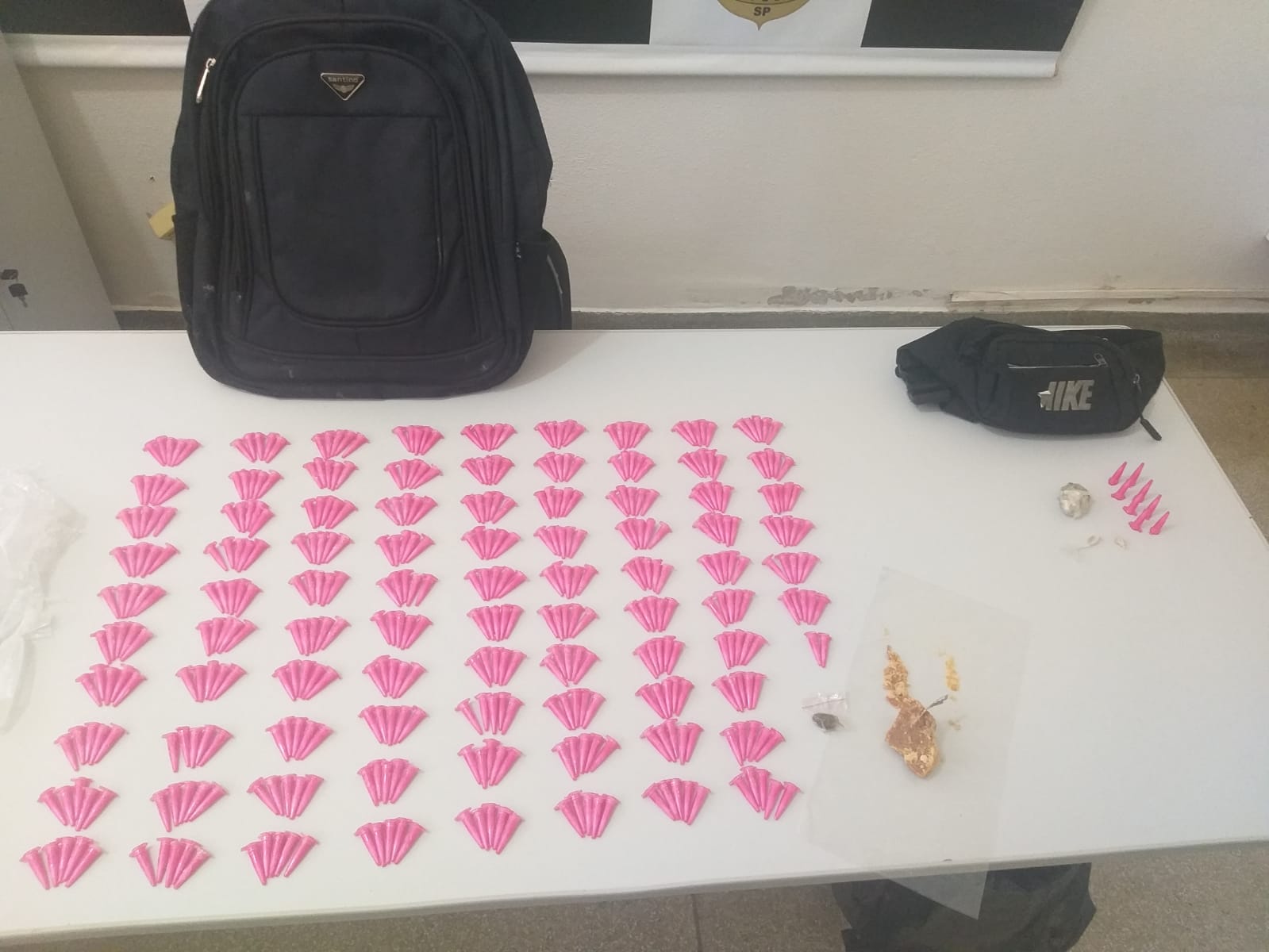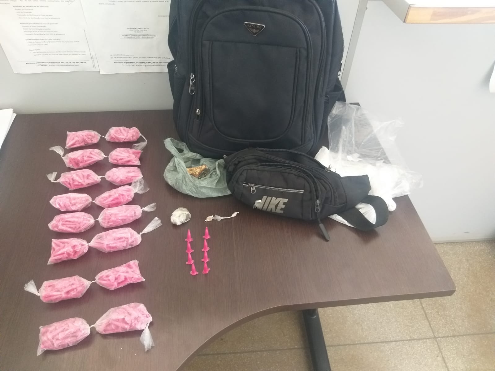 Segundo informações, os cabos Vale e Alexsandro foram checar uma denúncia de tráfico de drogas e no local encontraram um casal usando drogas. Ambos foram abordados e com a feminina A.C.S.A, foi encontrada uma pochete e no interior 8 pinos de cocaína, 2 pedras de crack e 1 porção de maconha. O masculino E. O.D, foi questionado se havia drogas na casa, mas disse que não. Durante a busca no imóvel, foi localizada uma mochila contendo em seu interior 432 pinos de cocaína, 1 pedra bruta de crack pesando 46 gramas e 1 porção de maconha. Na casa estava também a mulher do suposto traficante. Ela estava dormindo e também foi encaminhada para a Delegacia de Polícia Civil. O casal abordado fazendo uso de drogas foi autuado em flagrante por tráfico e recolhido ao Centro de Triagem de São Carlos.