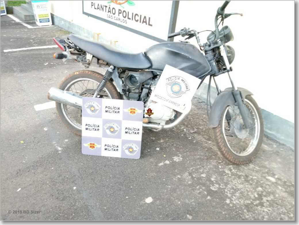 A Polícia Rodoviária de São Carlos-SP deteve dois jovens de 21 e 17 anos nesta tarde de sexta-feira, 05-01-2018, com uma moto furtada. A dupla, segundo consta, foi detida na rodovia SP-215, próximo ao bairro Cidade Aracy.