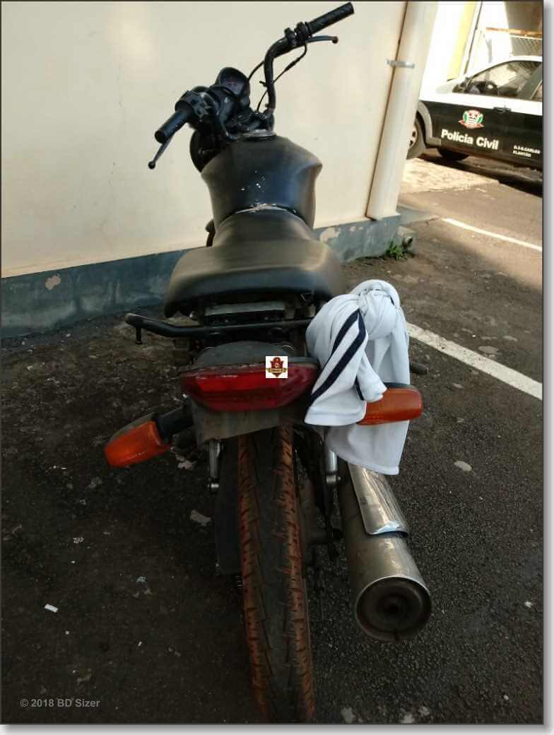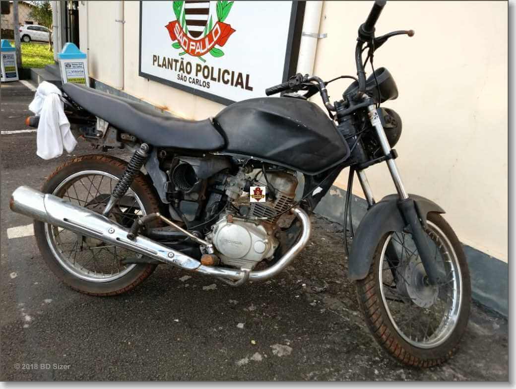 Segundo informações, a moto 150 KS da cor prata, placa de São Carlos, havia sido furtada no dia 30-12-2017. Nesta tarde a Polícia Rodoviária recebeu denúncia que a moto estava abandonada na referida rodvia. Os policiais, cabo Edymar e soldado Filho abordaram os jovens e constaram que a moto era furtada e que estava completamente adulterada. A moto estava pintada de preto. A dupla foi encaminhada ao Plantão Policial onde contou para a autoridade de plantão que a moto foi comprada por trezentos reais. Ou seja, cento e cinquenta cada. O maior foi autuado em flagrante por receptação e o menor ficou à disposição da família.