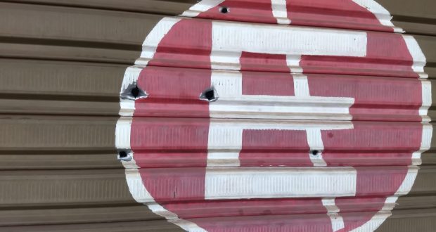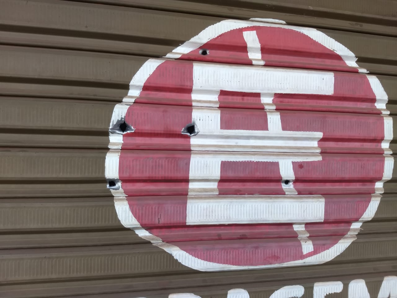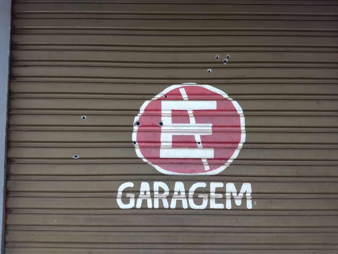 A porta de um comércio foi atingida por diversos disparos de arma de fogo nesta madrugada de sexta-feira, 2 de outubro de 2020, na Rua Araraquara, Ibaté-SP.
