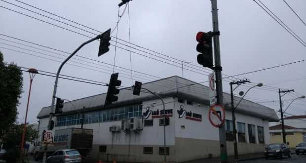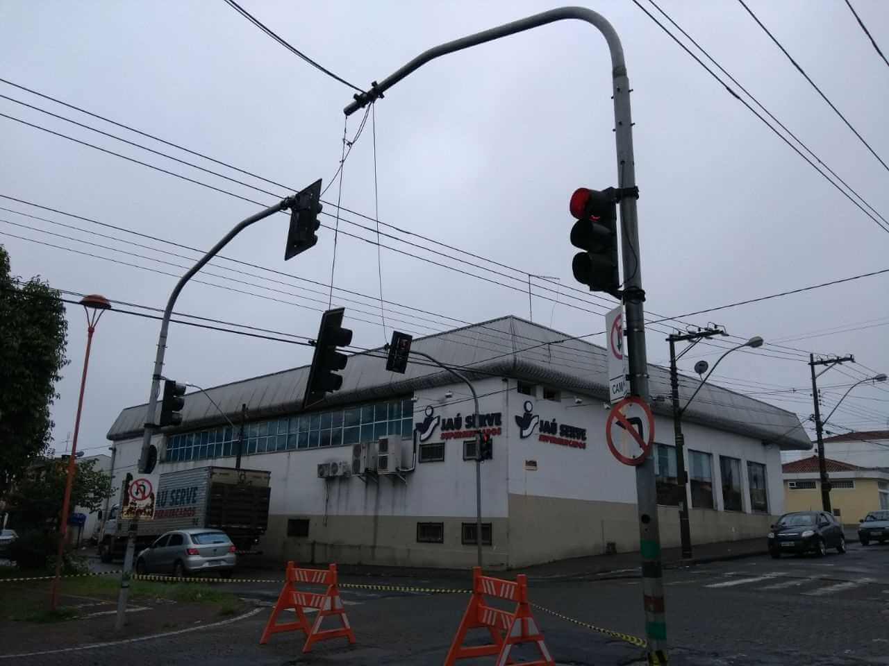Parte do semáforo estava pendurada somente pelos fios. Não sabemos o que de fato aconteceu. Aparentemente algum caminhão tenha causado o fato.