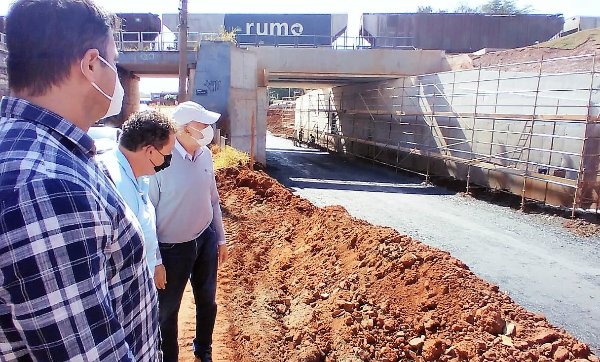O prefeito Airton Garcia, acompanhado dos secretários Mariel Olmo de Serviços Públicos, Paulo Luciano de Transporte e Trânsito e do chefe de gabinete da Prefeitura, José Pires (Carneirinho), acompanhou na manhã desta terça-feira (10/05), as obras que estão sendo finalizadas pela empresa RUMO na Praça Itália.