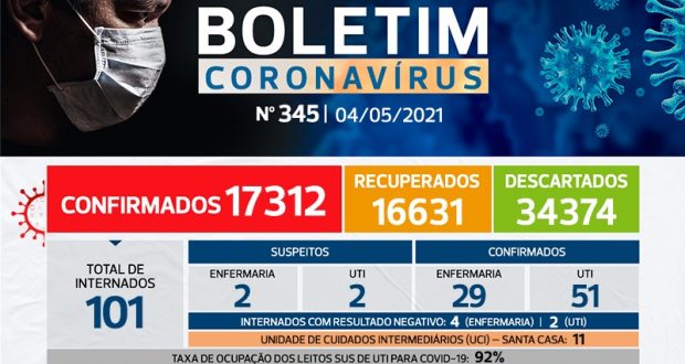 A taxa de ocupação dos leitos especiais para COVID-19 de UTI/SUS adulto está em 92% (34 adultos estão internados). Neste momento a cidade opera com 37 leitos de UTI/SUS para adultos, sendo 27 na Santa Casa e 10 no Hospital Universitário (HU).