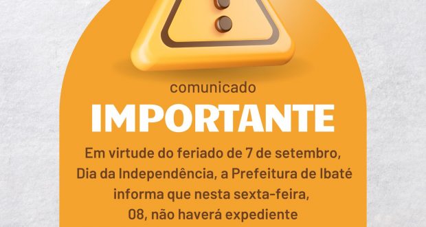 Em virtude do feriado de 7 de setembro, Dia da Independência, a Prefeitura de Ibaté informa que nesta sexta-feira, 08, não haverá expediente nas repartições públicas, mantendo o funcionamento apenas os serviços essenciais.
