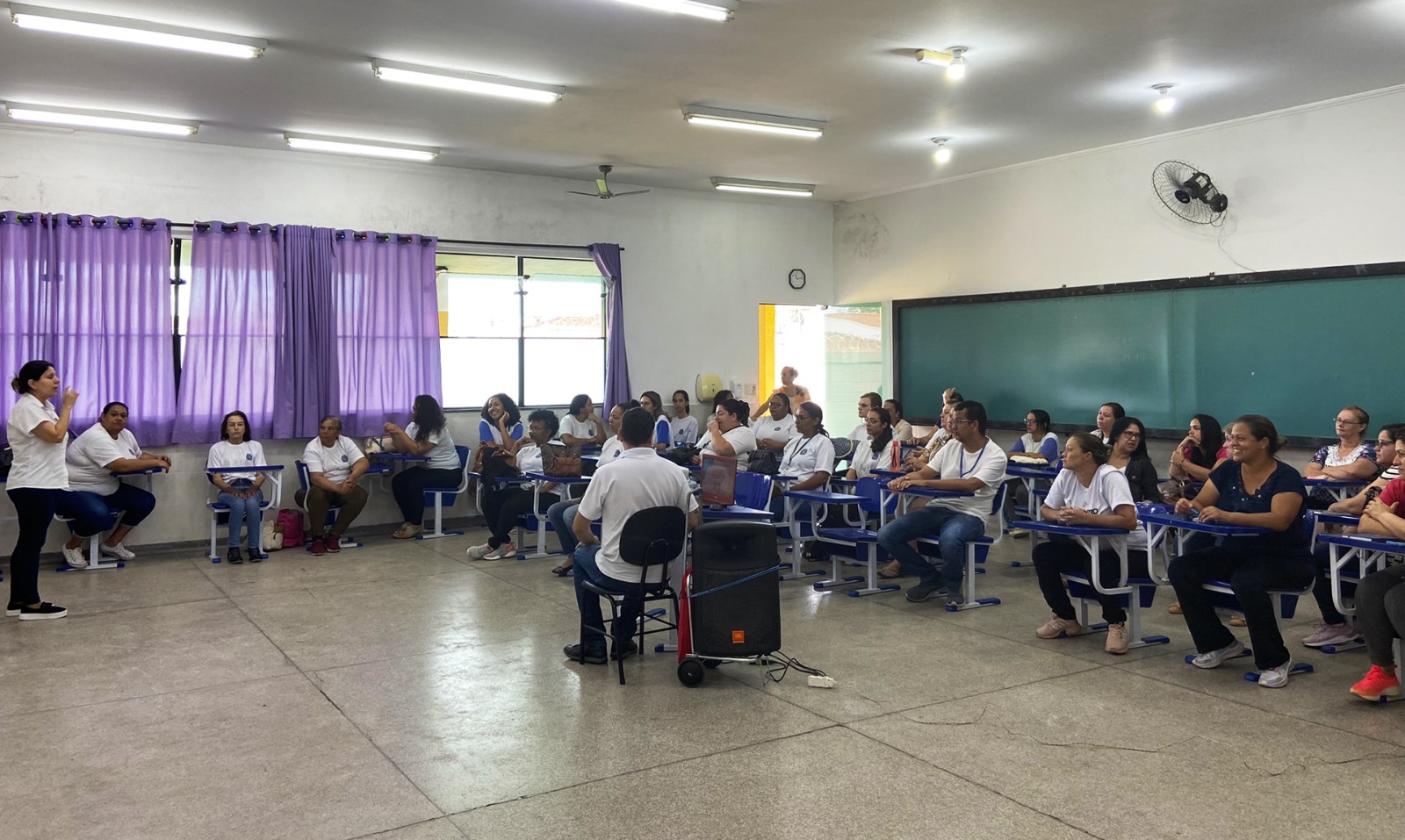 Essa capacitação é feita uma vez por ano, abrangendo todas as cozinheiras e auxiliares de cozinha, desde escolas municipais, estaduais e até creches. Após o treinamento foi realizado um café da manhã e momento de descontração.