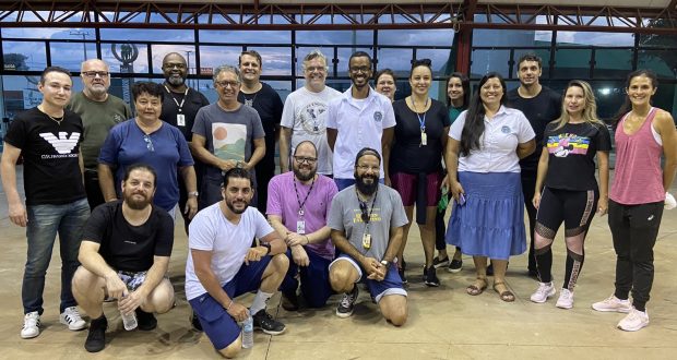 Os professores da disciplina de Educação Física da rede municipal também participaram da oficina, pois essa prática agrega conhecimento e possibilidades para o referido campo de atuação; reiteramos que a formação faz parte da capacitação e planejamento pedagógico dos professores da rede municipal.