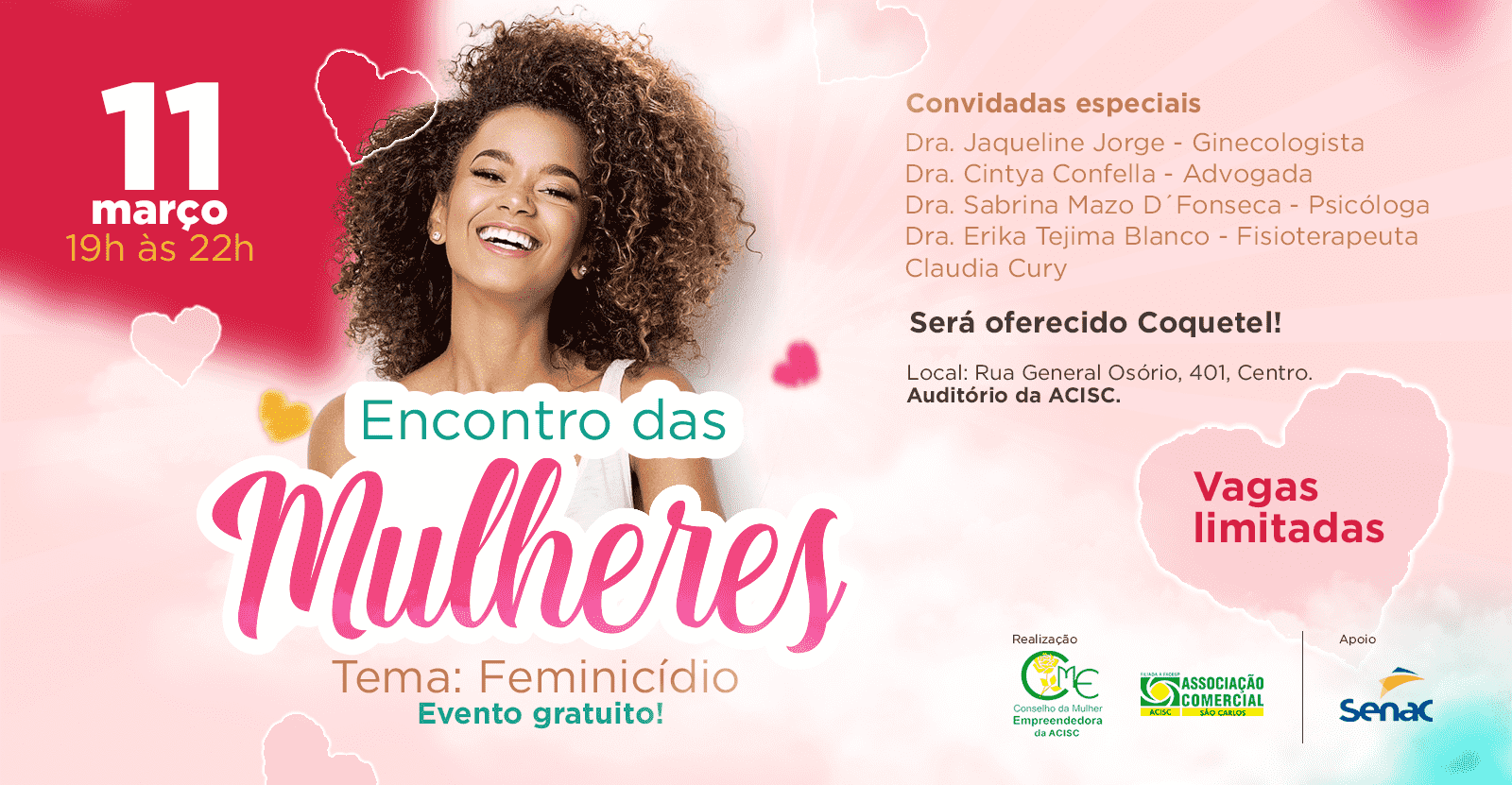 A Associação Comercial e Industrial de São Carlos (ACISC) e o Conselho da Mulher Empreendedora (CME), com o apoio do Senac (Serviço Nacional de Aprendizagem Comercial), realizam nesta quarta-feira, 11 de março, o “Encontro das Mulheres”.