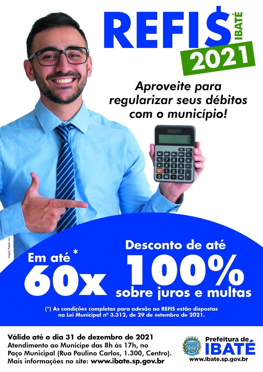 A Prefeitura de Ibaté informa que segue em andamento do Plano de Recuperação Financeira (REFIS) 2021, com o desconto de até 100% sobre juros e multas.O programa, que segue até o dia 31 de dezembro, dá aos contribuintes de Ibaté a oportunidade de quitar suas dívidas com a Prefeitura de forma simples.