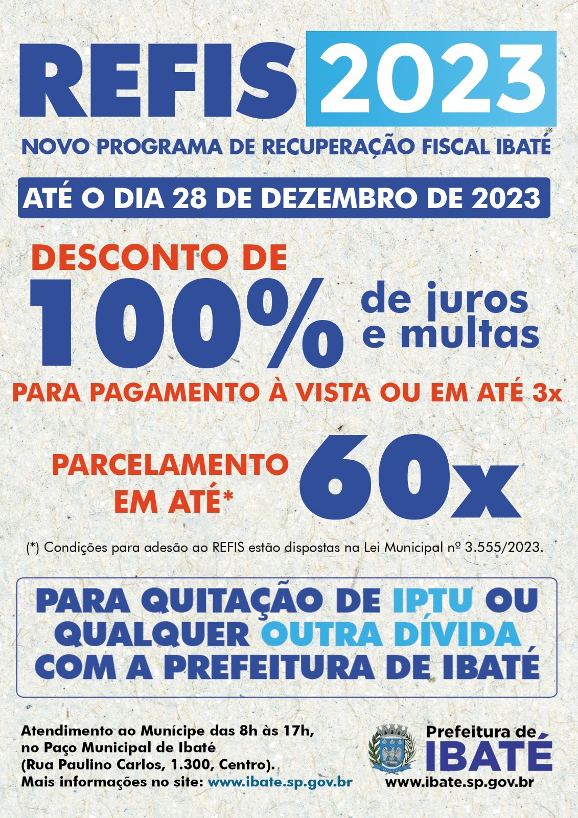 A Prefeitura de Ibaté, informa que já iniciou o REFIS 2023, com o objetivo de auxiliar os contribuintes em débito com o erário municipal, de forma facilitada, conforme a Lei Municipal nº 3.555/2023, que se estende até o dia 28 de dezembro de 2023.