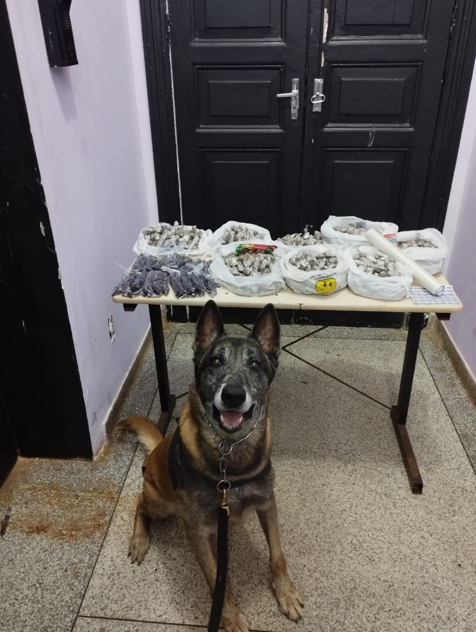 Segundo informações, o Canil do BAEP estava em patrulhamento, quando abordou um indivíduo. Os policiais receberam denúncia que ele guardava drogas nas proximidades. O cão do farejador encontrou 416 pinos de cocaína e 781 porções de maconha.  O meliante foi encaminhado para a Delegacia da Polícia Civil, onde ficou à disposição da justiça.