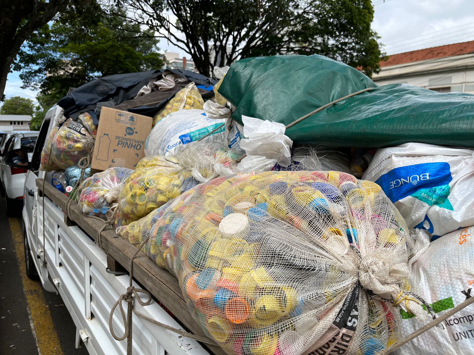 arrecadados 402 galões de 5 litros contendo tampinhas de garrafas pet e 252 garrafas de 2 litros com lacres