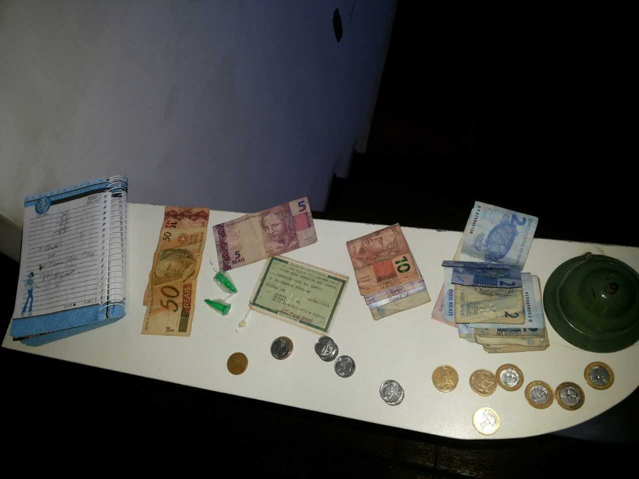 Com o mesmo, segundo a PM, foram localizados dois pinos com cocaína, uma pedra crack, um caderno de anotações.