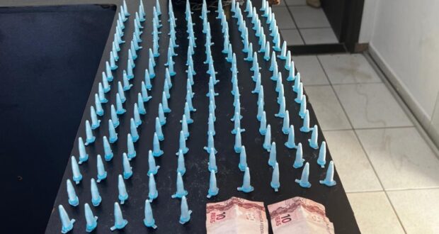 Segundo informações, policiais da ROCAM estavam em patrulhamento pelo bairro Santa Maria, quando adentraram a Rua Quatorze , avistaram um indivíduo saindo do mato e fazendo contato com uma motocicleta. Ao perceber a aproximação da equipe a motocicleta se evadiu, não sendo possível abordar. O indivíduo que saiu do mato foi abordado, com ele foram localizados 10 pinos de cocaína e R$20,00 . O abordado acabou mostrando onde escondia o restante da droga. Foram apreendidos mais 165 pinos de cocaína. B. F. Z, de 32 anos, foi encaminhado para a Delegacia da Polícia Civil, onde foi autuado em flagrante por tráfico de drogas e recolhido ao presídio local.