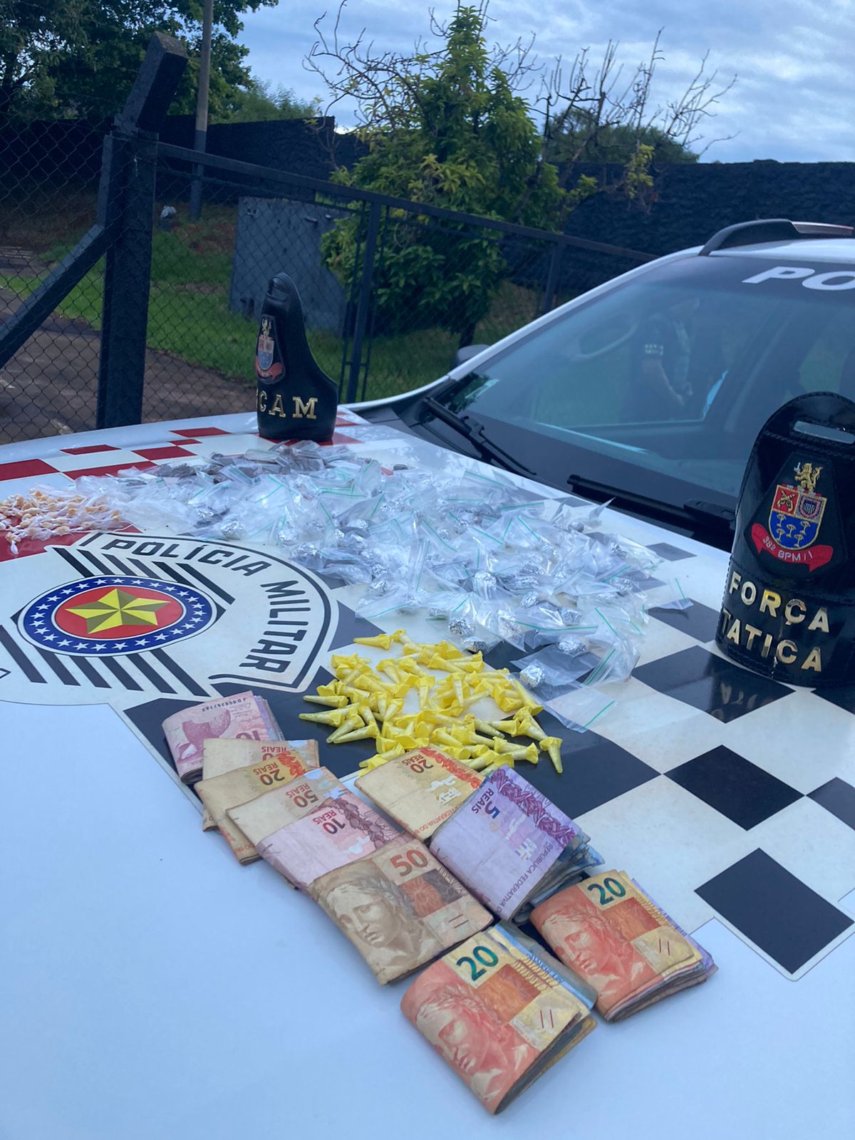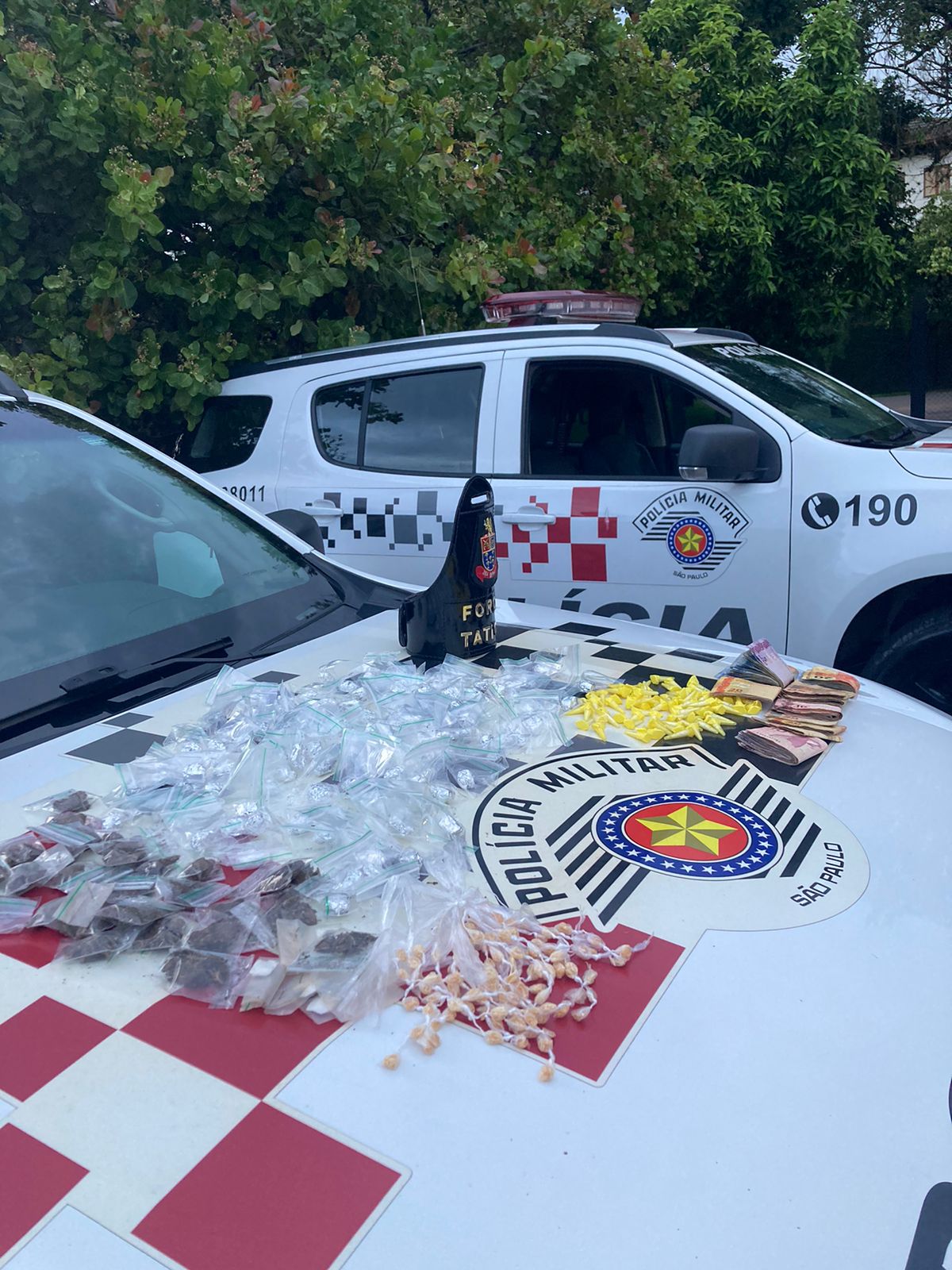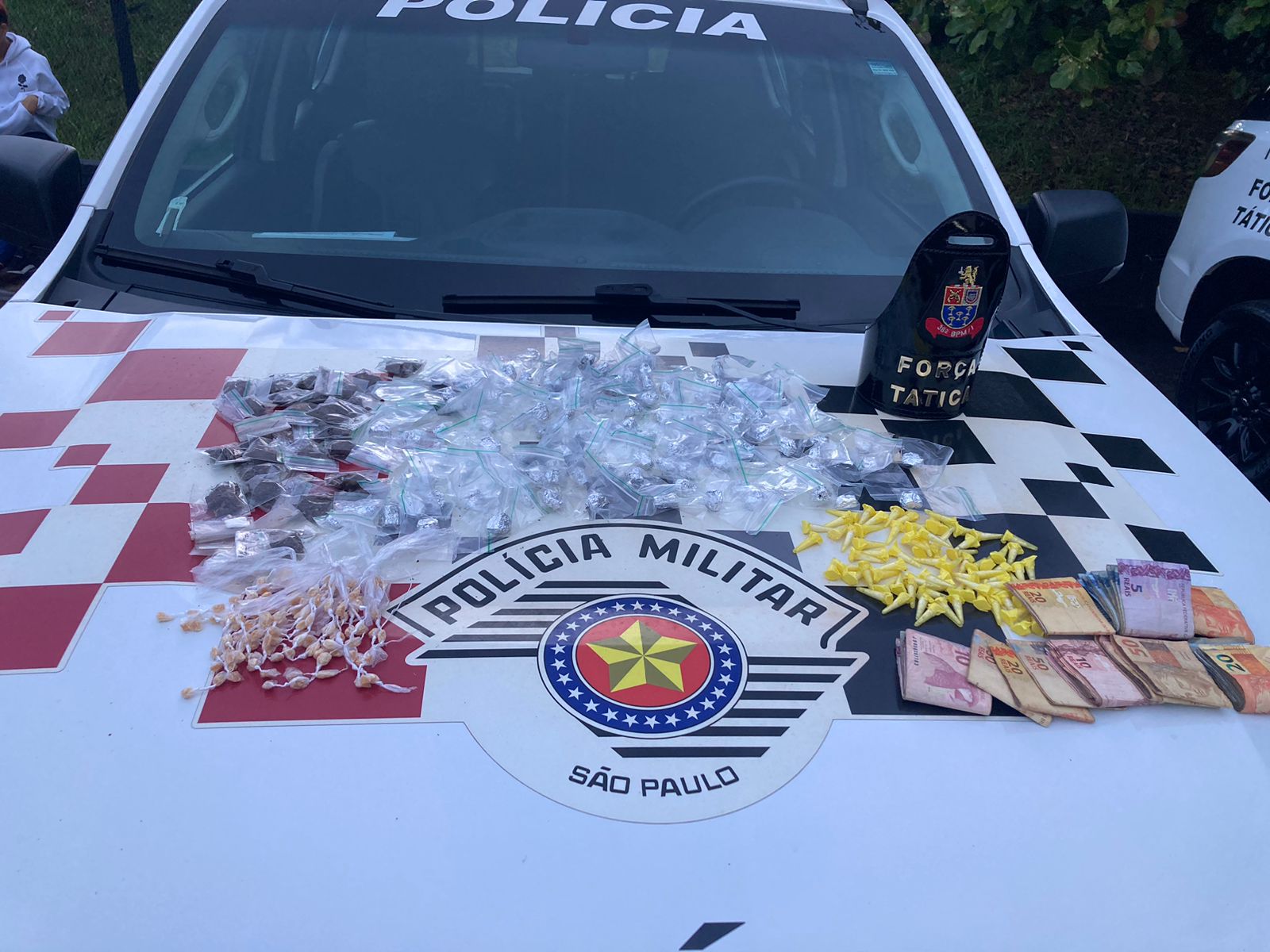 Policiais militares da ROCAM detiveram um homem e uma mulher por tráfico de drogas nesta tarde de quinta-feira, 11 de janeiro de 2024, na Rua Conselheiro Soares Brandão, bairro Vila Pureza, São Carlos-SP.