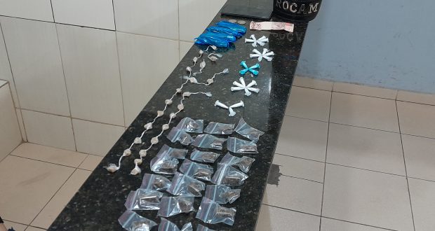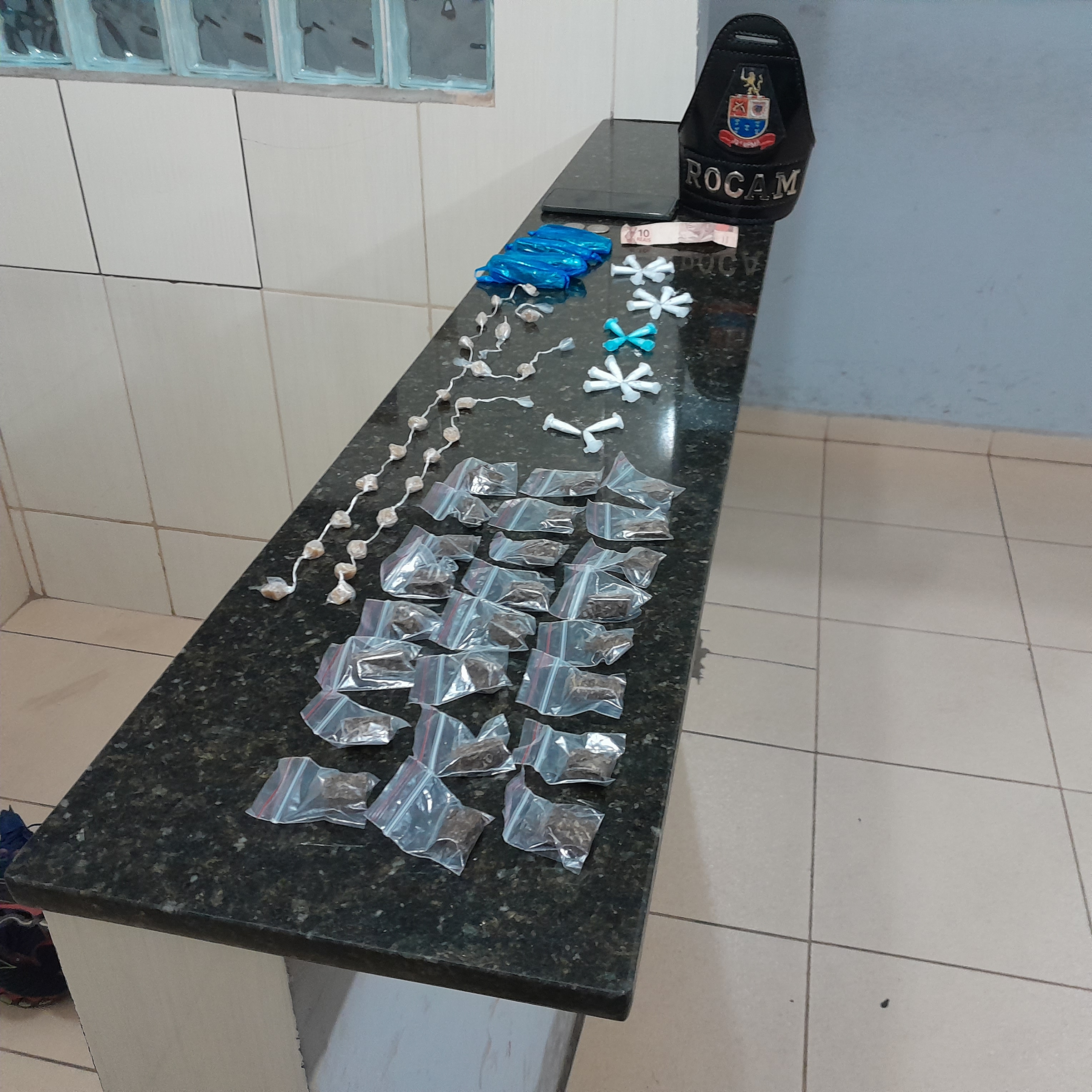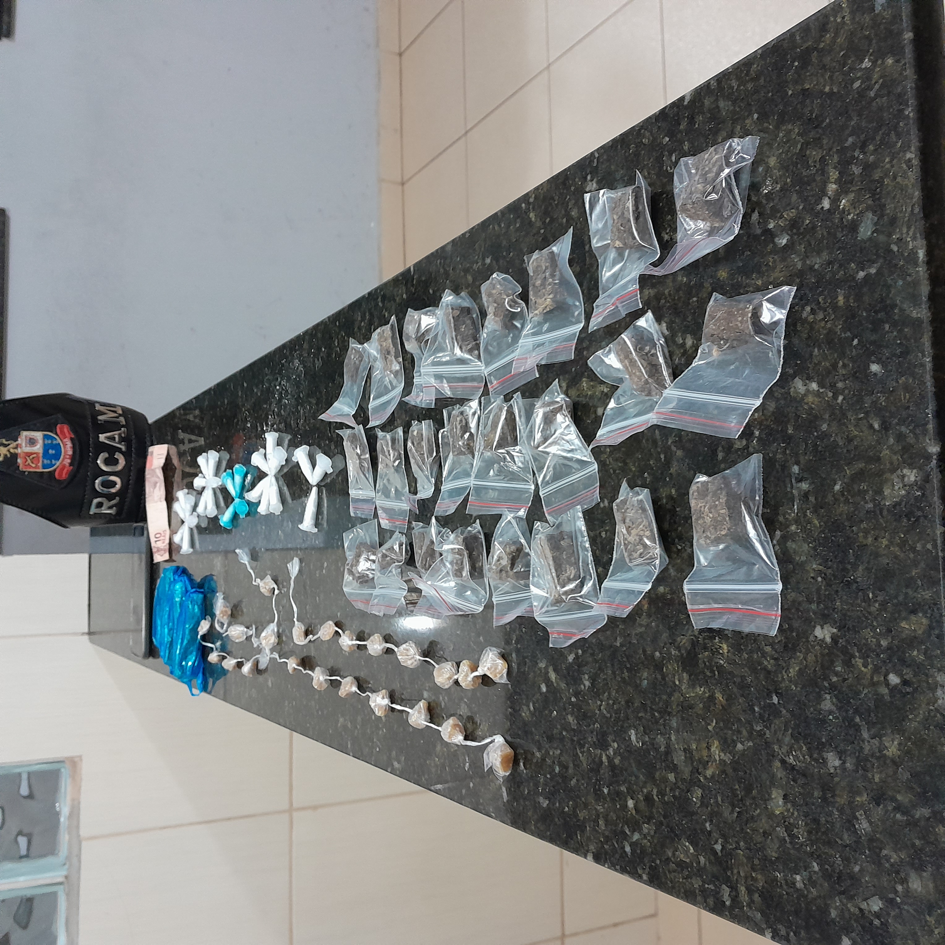 De acordo com informações, o cabo Gigante e cabo Soares, estavam em patrulhamento, momento que avistaram H.S.A, 19 anos, o qual saiu correndo e jogou uma sacola no telhado de um sobrado. Na sacola foram localizados 25 pinos de cocaína, 23 porções de crack, 28 porções de maconha, 12 reais e um celular. A ocorrência foi encaminhada para a Central de Polícia Judiciária, onde o detido ficou à disposição da justiça.