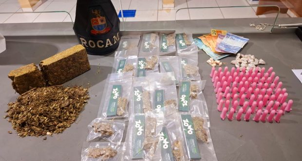 De acordo com  informações, os policiais  cabo Oliveira, o cabo Soares e o soldado Amaral, estavam realizando operação policial, quando avistaram um adolescente correndo. Ele foi abordado e na sacola, a qual estava em seu poder, foram encontrados  700 gramas de maconha , 78 pinos de cocaína, 22 maconha colômbia, 15 quites de maconha com papel seda , 06 pedras de crack e R$ 201,00 . O menor, que segundo a PM, já tem antecedentes criminais por tentativa de homicídio, foi encaminhado para a Delegacia da Polícia Civil, onde ficou à disposição da família.