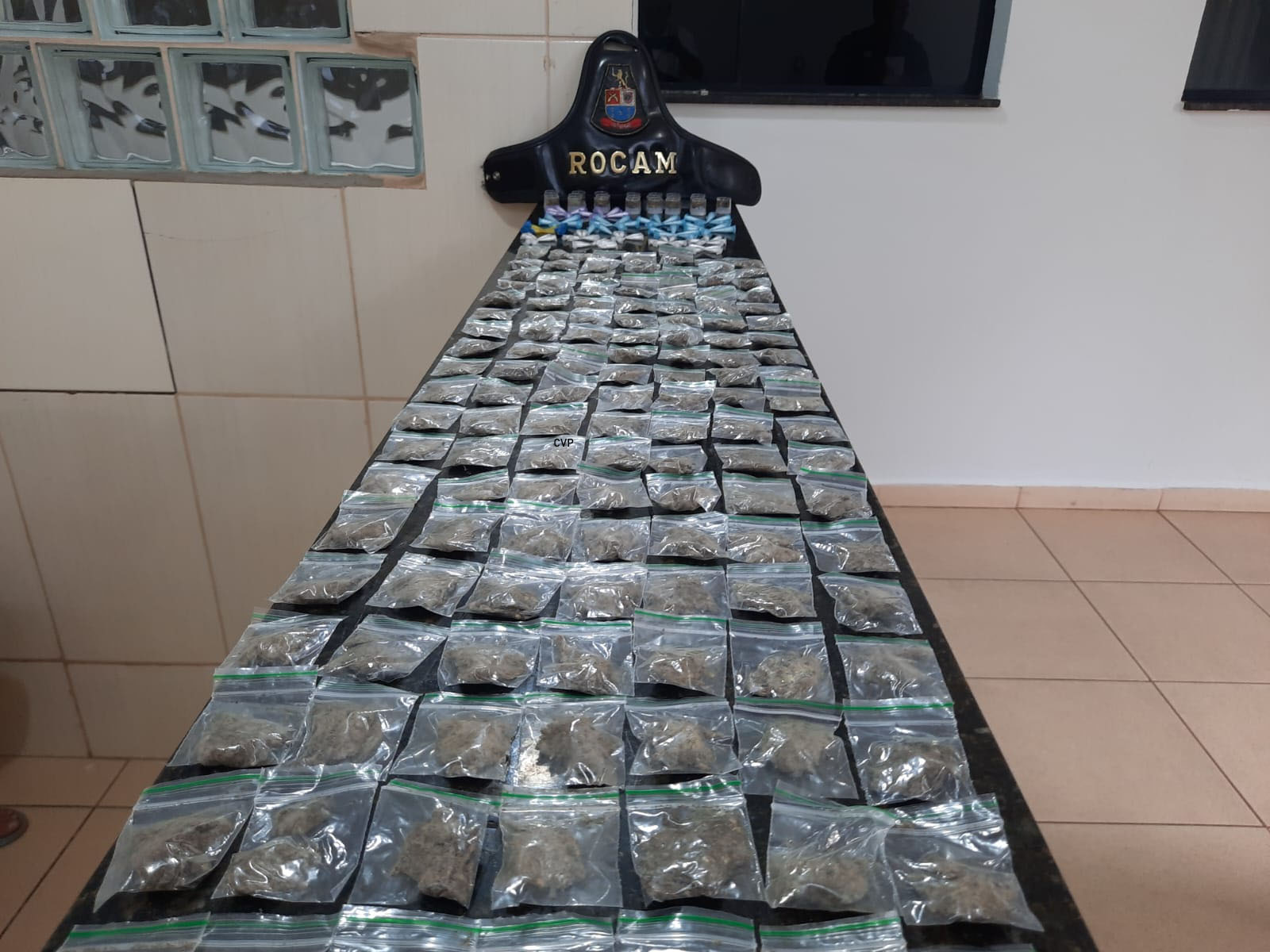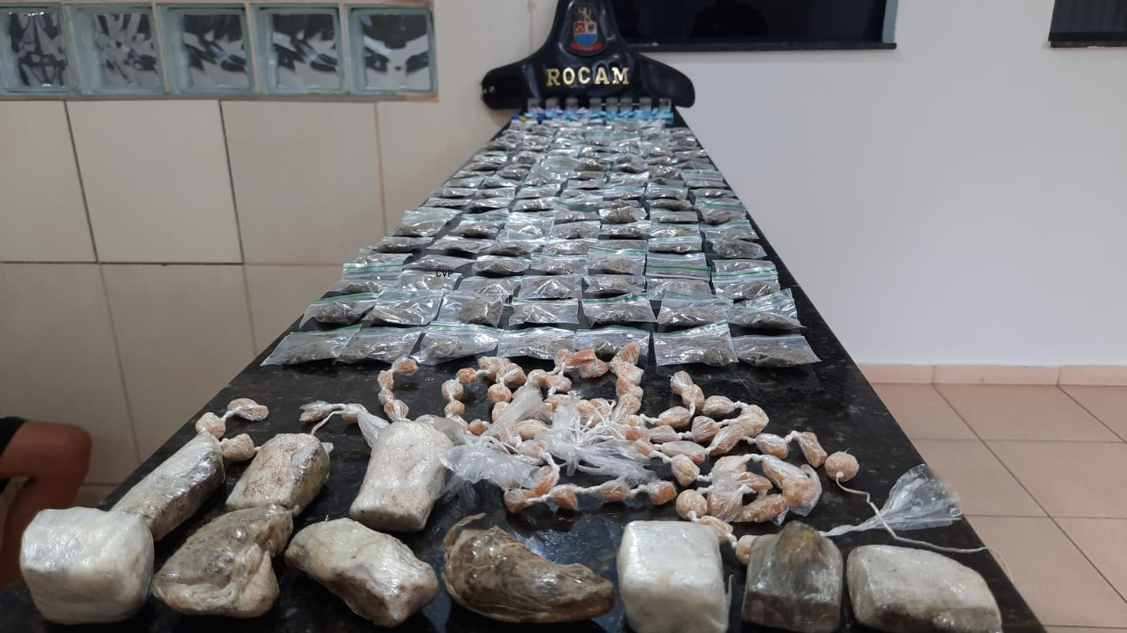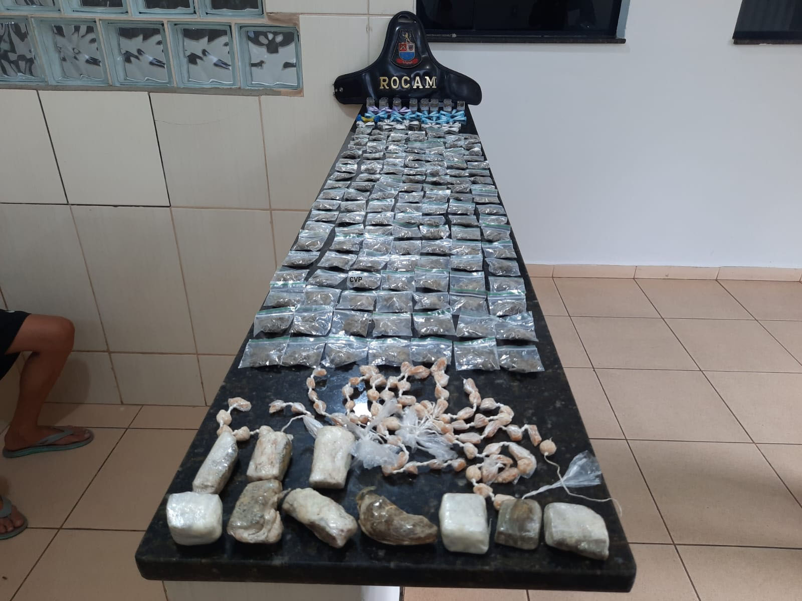 No total foram apreendidos 10 tijolos pequenos de maconha, 133 invólucros de maconha, 22 skank, 88 pinos de cocaína e 76 pedras de crack.