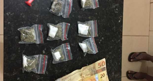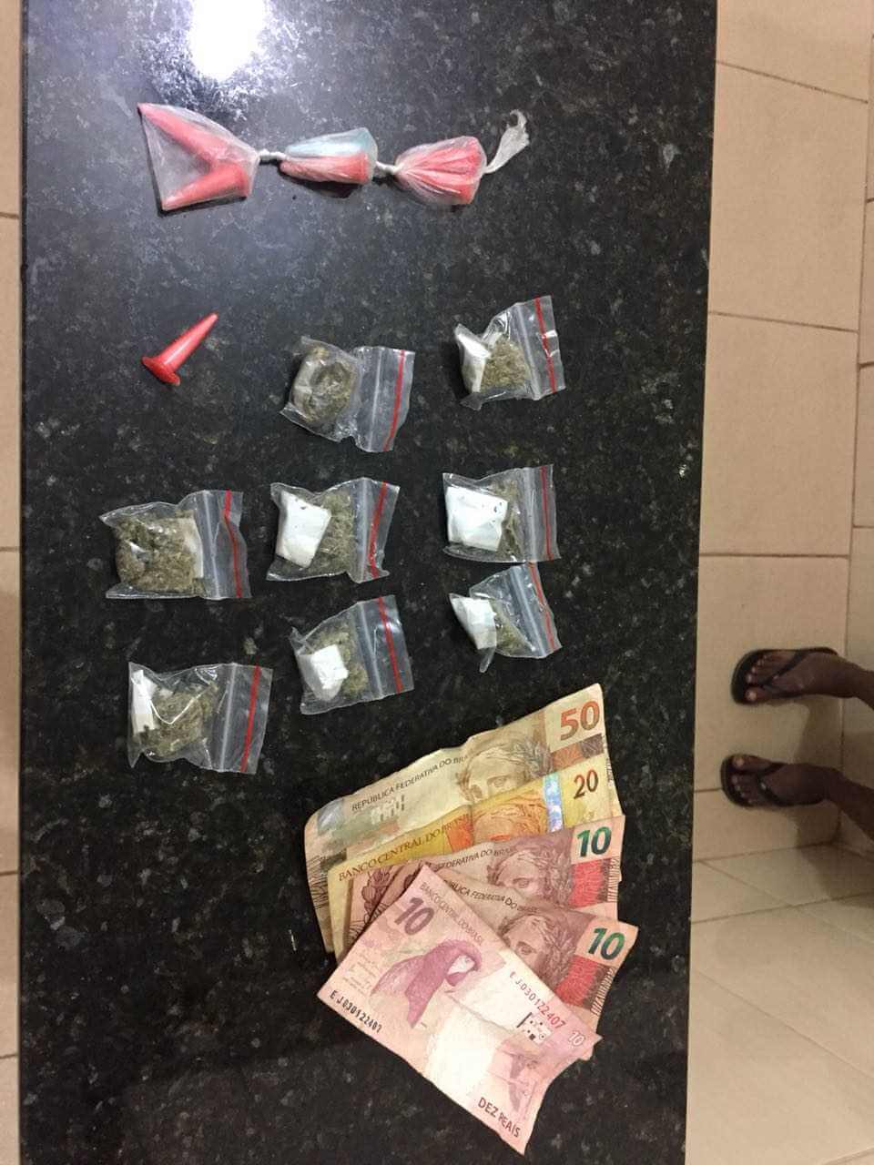 Segundo informações, os soldados Campos, Amaral e Trindade estavam em patrulhamento quando avistaram o menor mexendo em um buraco na rua. Este saiu correndo, mas foi abordado. Com o mesmo foi localizado um pino de cocaína e dez reais. Os policiais retornaram onde o mesmo estava e mais drogas foram localizadas. O delinquente foi encaminhado ao Plantão Policial e entregue para a família.
