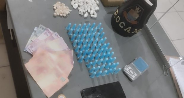 De acordo com informações, os policiais da ROCAM, o cabo Campos, o cabo Soares e os soldados Amaral e  Albuquerque, estavam em patrulhamento preventivo, quando avistaram um indivíduo correndo com uma sacola na mão. O suspeito foi abordado e na sacola foram localizados  67 pinos de cocaína, 48 porções de maconha, 13 pedras de crack (grandes), mais  28 pedras de crack (pequenas), 02 porções da maconha K9, um tijolo de maconha, R$ 91,00, um celular, uma balança de precisão e anotações do tráfico. O adolescente, o qual já tem duas passagens pelo crime de tráfico de drogas,  foi encaminhado para a Delegacia da Polícia Civil, onde ficou à disposição da família.