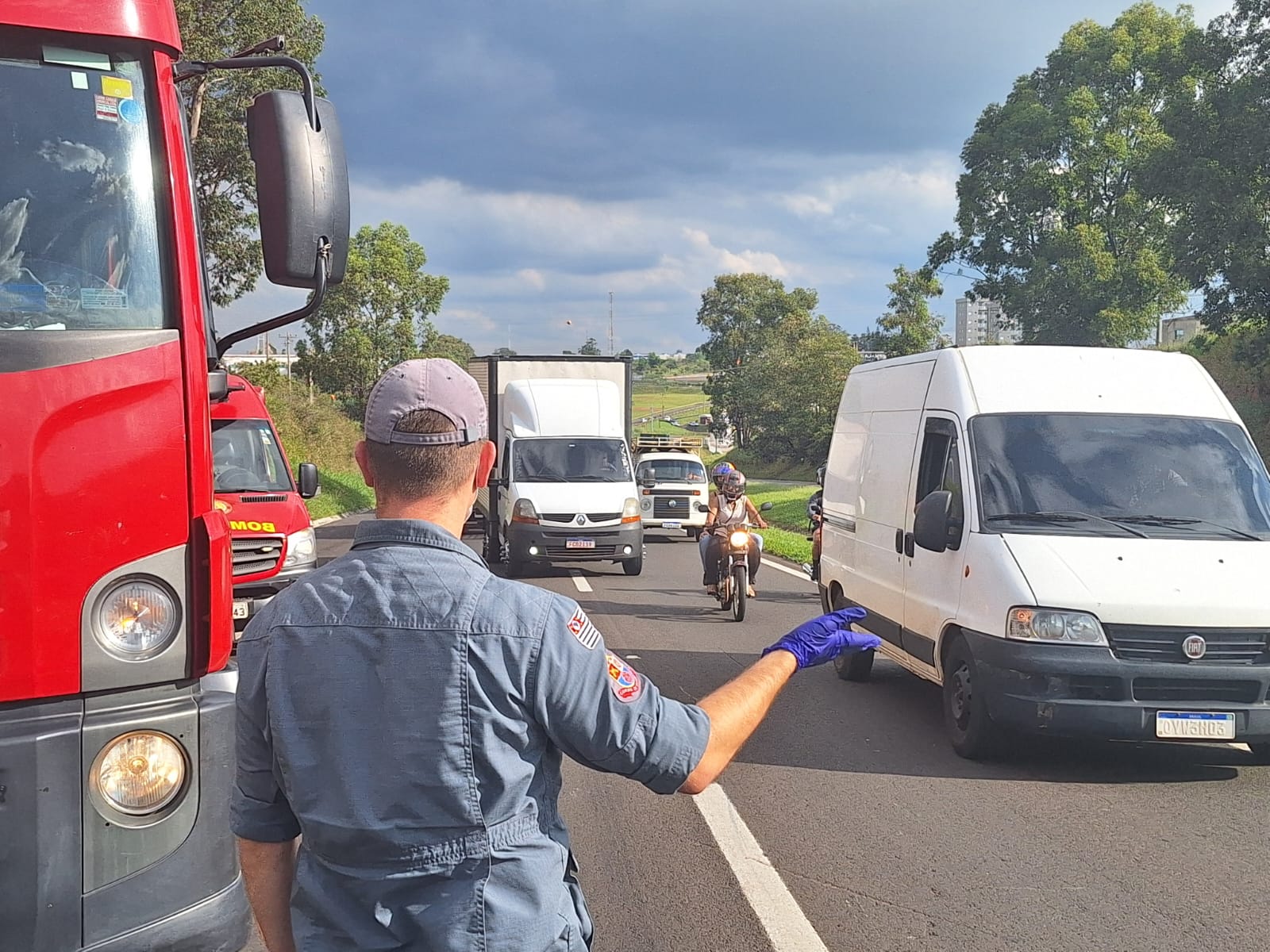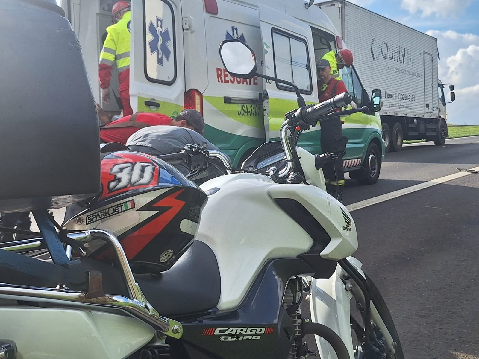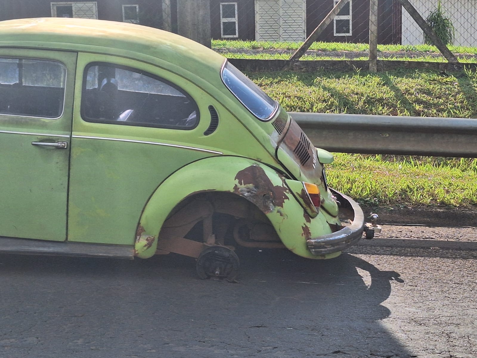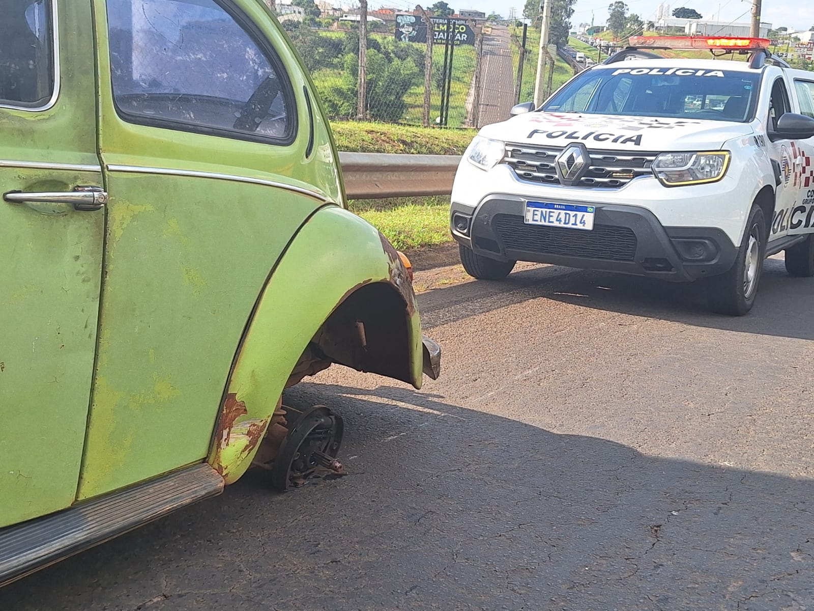 De acordo com informações, o motociclista transitiva no sentido sul e o Fusca no sentido norte. A roda do Fusca se soltou, atravessou a rodovia e atingiu a moto. O motociclista caiu e ficou ferido. O socorro foi acionado e socorreu a vítima para a Santa Casa, aparentemente sem gravidade.