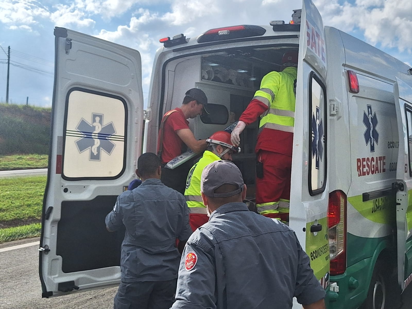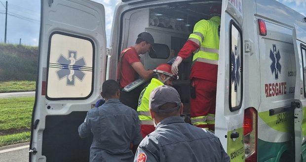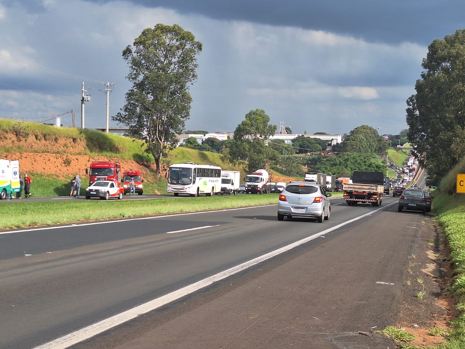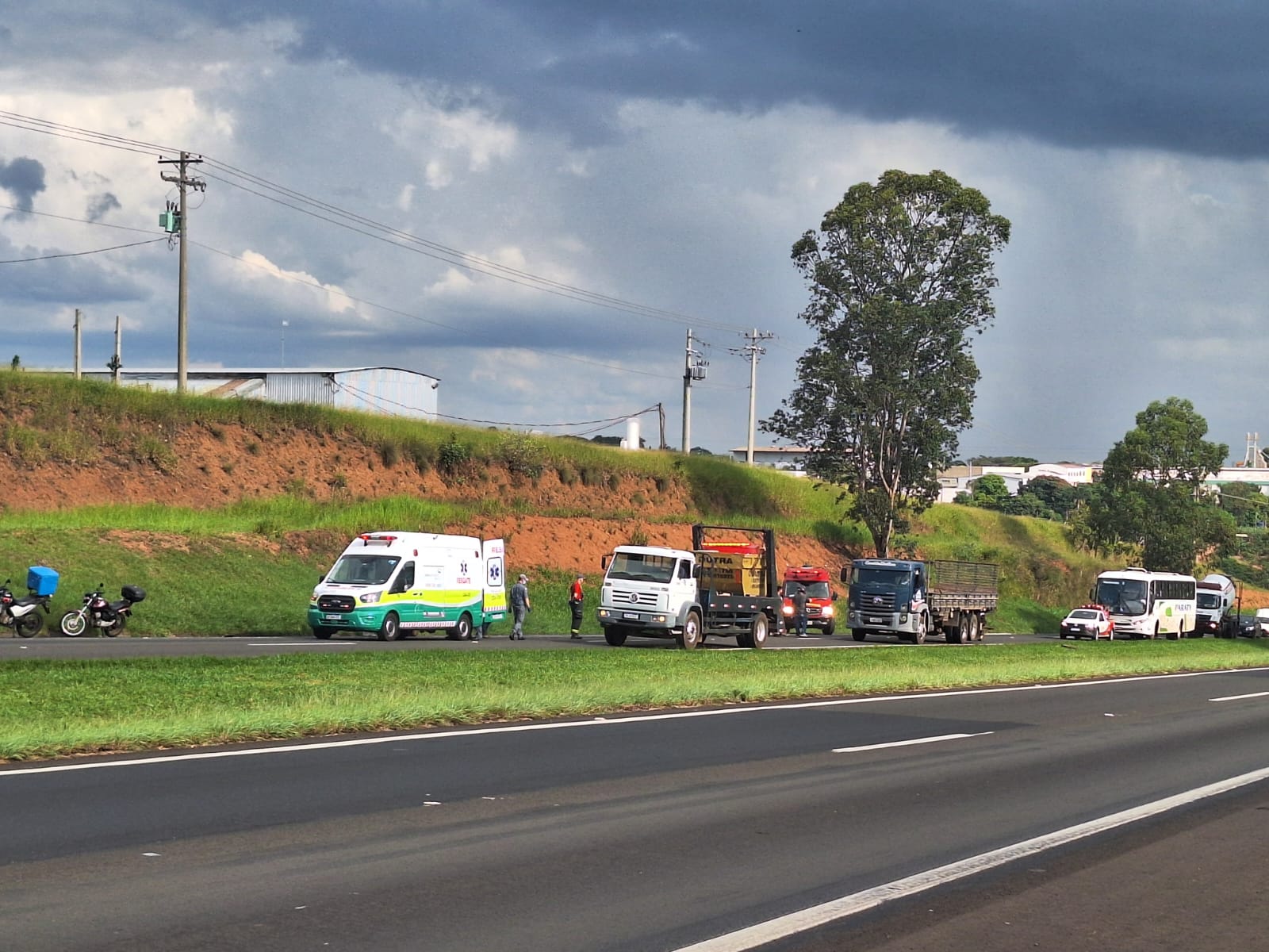 De acordo com informações, o motociclista transitiva no sentido sul e o Fusca no sentido norte. A roda do Fusca se soltou, atravessou a rodovia e atingiu a moto. O motociclista caiu e ficou ferido. O socorro foi acionado e socorreu a vítima para a Santa Casa, aparentemente sem gravidade.