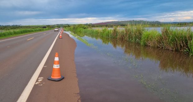Por conta das chuvas intensas dos últimos dias, a água já começava a invadir a rodovia no final da tarde, no trecho entre Araraquara-SP e Boa Esperança do Sul-SP.
