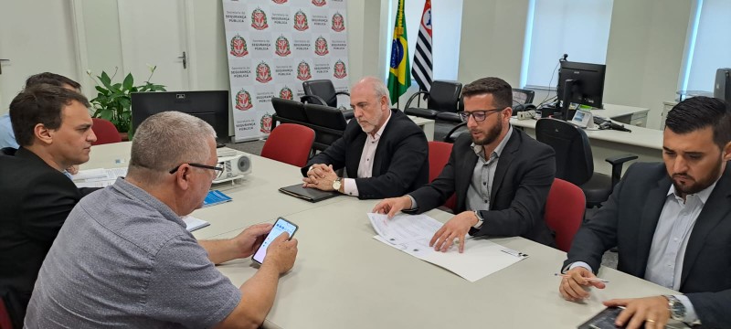 O secretário municipal de Segurança Pública, Samir Gardini e adjunto da pasta, Paulo Cesar Belonci, acompanhados do vereador Elton Carvalho, se reuniram nesta segunda-feira (06/02), com o secretário de Segurança do Estado, Capitão PM Guilherme Derrite.