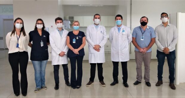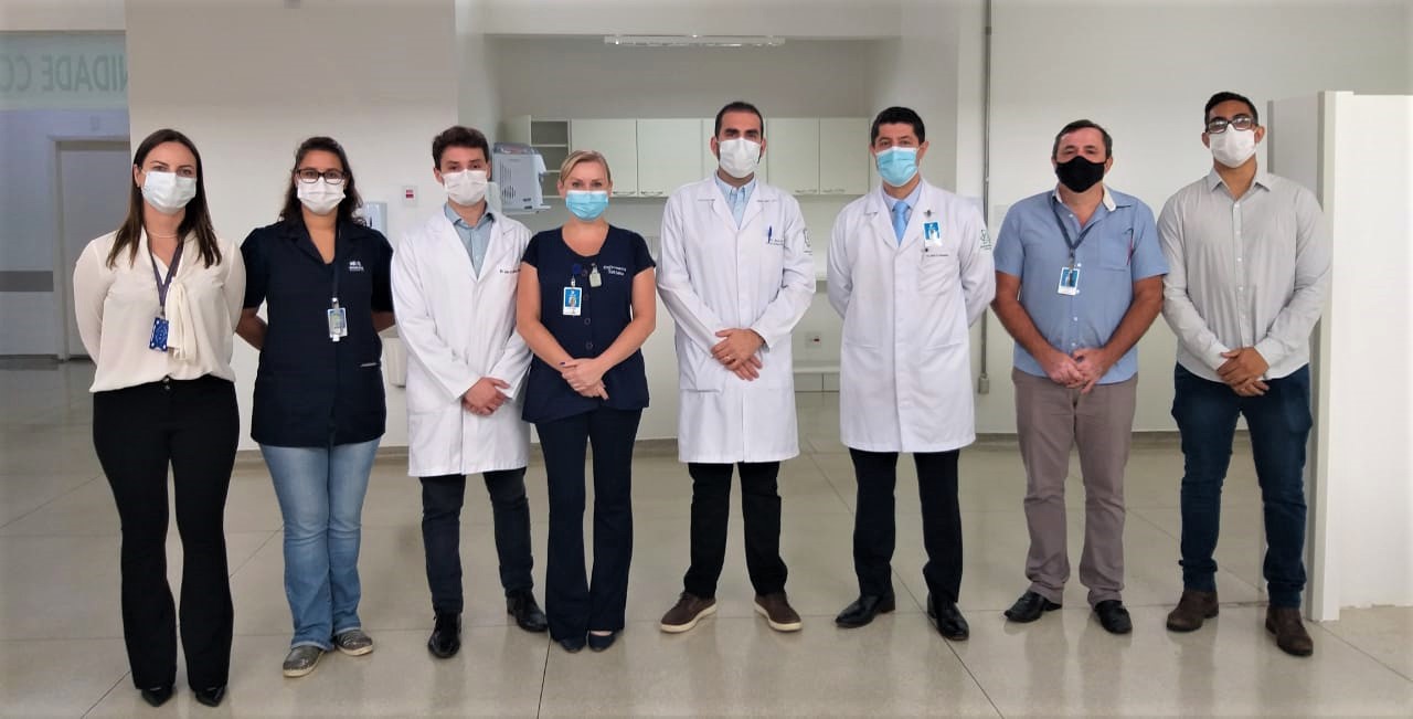 Da esquerda para direita: Mariana Danella, gerente de Operações; Amanda de Assunção Lino, enfermeira Controladora de Infecção; Luiz Oliveira, nefrologista e médico intensivista; Tatiana Zanqueta Rodrigues, coord enfermagem das UTIs; Bento Gomes de Moraes Neto, coordenador das UTIs; Flávio Guimarães, diretor clínico; Adalberto Vicente de Araújo Júnior, Gerente de Controladoria; e Marcus Vinícius Tiburcio, Coord Engenharia Clínica e Manutenção Elétrica
