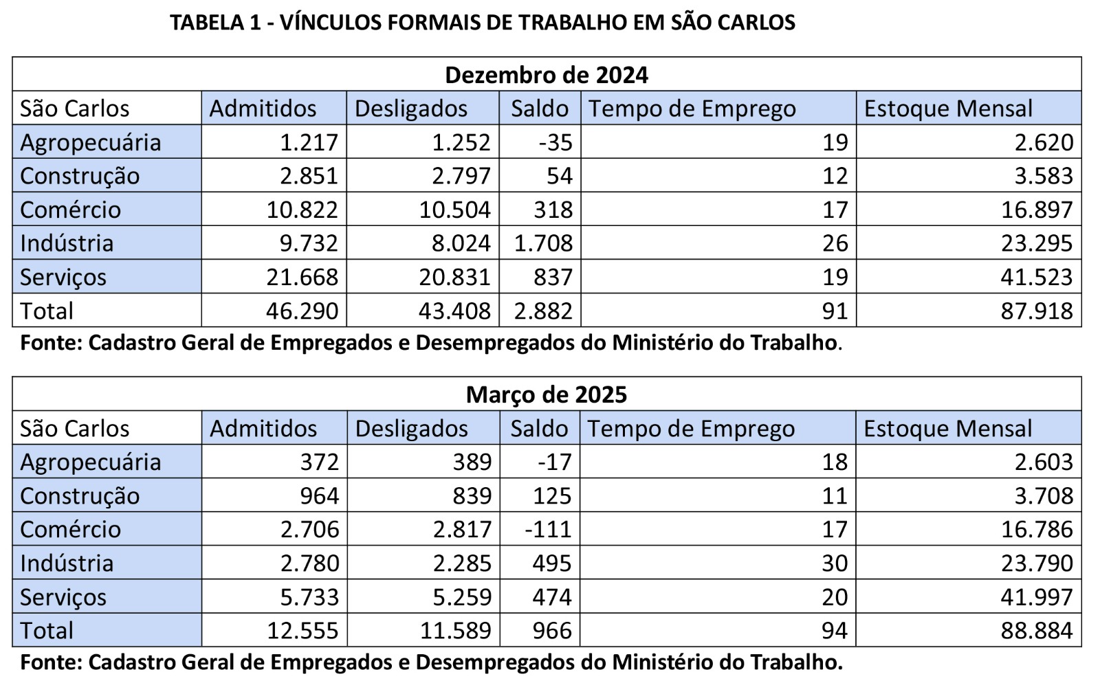 O salário médio de admissão em São Paulo foi de R$ 2.502,00, o mais alto entre os estados, superando a média nacional de R$ 2.225,00. Já em São Carlos, os dados completos por setor estão disponíveis nas Tabelas 1 e 2 do informativo.