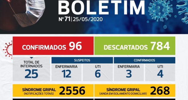 Dos 96 positivos, 72 apresentaram Síndrome Gripal e não foram internadas, 24 pessoas precisaram de internação devido a COVID-19, 14 receberam alta hospitalar, 6 permanecem internados (3 UTI e 3 enfermaria adulto) e 4 positivos foram a óbito.
