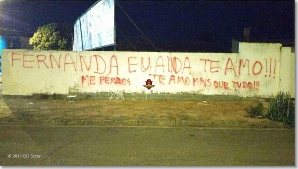 Segundo informações, era por volta da 0:30 quando a GM viu através de seu sistema de monitoramento que um homem estava escrevendo no muro. Uma equipe foi ao local e lá se deparou com o são-paulino escrevendo para a mulher amada. Ele que só queria o perdão da Fernanda, mas acabou detido na delegacia, por pichação. Após se explicar para a autoridade, foi liberado.