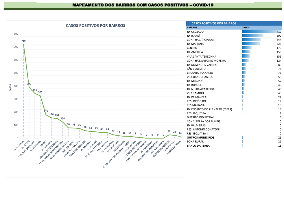 Entre os bairros, o Jardim Cruzado continua registrando o maior número de casos pela doença (719), seguido pelo Jardim Icaraí (390), Conjunto Habitacional Popular (344), Jardim Mariana (325), Centro (179), Jardim América (156), Vila Santa Terezinha (151), Antônio Moreira (124), Domingos Valério (80), São Benedito (78), Encanto do Planalto (75), Vila Bandeirantes (58), Jardim Menzani (52), Jardim do Bosque (49), Jardim Nossa Senhora Aparecida (43), Vila Tamoio (43), Jardim Primavera (27), Residencial José Giro (19), Residencial Mariana (15), Esfér (14), Residencial Jequitibá (9), Distrito Industrial (5), Banco da Terra (13) e Zona Rural (22). Outros Municípios (26).