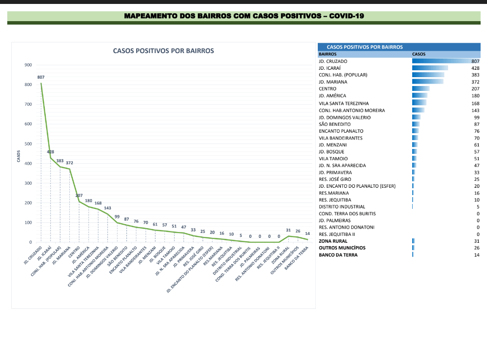 Entre os bairros, o Jardim Cruzado continua registrando o maior número de casos pela doença (807), seguido pelo Jardim Icaraí (428), Conjunto Habitacional Popular (383), Jardim Mariana (372), Centro (207), Jardim América (180), Vila Santa Terezinha (168), Antônio Moreira (143), Domingos Valério (99), São Benedito (87), Encanto do Planalto (76), Vila Bandeirantes (70), Jardim Menzani (61), Jardim do Bosque (57), Vila Tamoio (51), Jardim Nossa Senhora Aparecida (47), Jardim Primavera (33), Residencial José Giro (25), Esfér (20), Residencial Mariana (16),Residencial Jequitibá (10), Distrito Industrial (5), Banco da Terra (14) e Zona Rural (31). Outros Municípios (26).