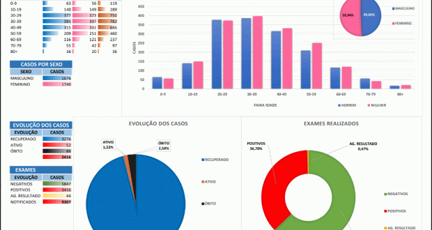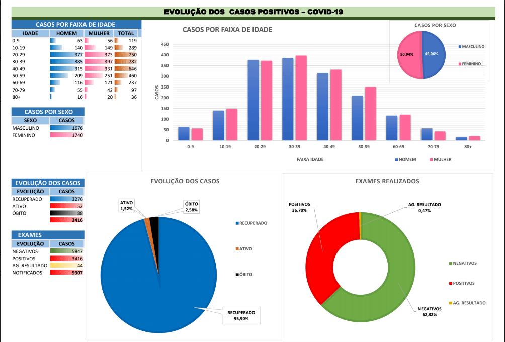 Desde o registro do primeiro caso na cidade –em abril de 2020 – até o último sábado, a cidade registrava um total de 5.847casos negativados (62,82%) e 0,47% aguardavam resultados de exames.