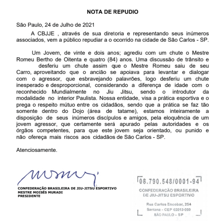 A confederação de de Jiu Jitsu do estado de São Paulo ao tomar conhecimento do fato divulgou uma nota de repúdio. Confira.