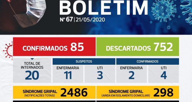 Subiu de 70 para 85 os casos positivos para a doença, com 4 mortes confirmadas. 26 óbitos já foram descartados. Dos 85 positivos, 62 apresentaram Síndrome Gripal e não foram internadas, 23 pessoas precisaram de internação devido a COVID-19, 13 receberam alta hospitalar, 6 estão internados e 4 positivos foram a óbito