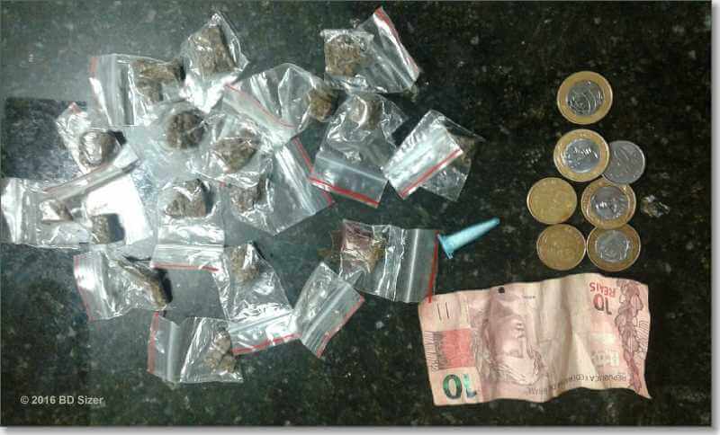Segundo boletim de ocorrência, eram por volta das 2:40, os policiais cabo Sabino e soldado Levez estavam em patrulhamento, avistaram dois indivíduos. Um saiu correndo e o outro jogou uma sacola para o alto, mas a mesma caiu ao solo e no seu interior, foram localizadas 18 trouxinhas de maconha . Edson Tiago Rodrigues, de 26 anos, disse que minutos antes havia encontrado um colega na rua e este ao ver a viatura passou a sacola para as suas mãos. Ele disse que desconhecia que era droga, mas a polícia não acreditou na versão do rapaz e o encaminhou ao Plantão Policial. Ele foi autuado em flagrante por tráfico de drogas e recolhido ao Centro de Triagem de São Carlos.