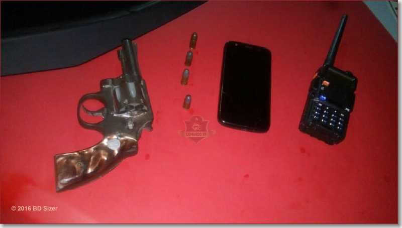 Segundo informações, aconteceu um roubo em uma residência, onde marginais amarraram as vítimas e roubaram objetos de valor. Depois deixaram as vítimas trancadas e fugiram. A PM em patrulhamento acabou abordando um veículo suspeito e no mesmo foi localizado uma arma de fogo e um rádio HT na frequência da PM. O condutor do carro foi encaminhado ao Plantão Policial e preso em flagrante por roubo. O restante da quadrilha já está sendo investigada pela DIG.