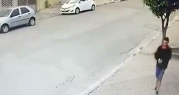 Nas imagens obtidas pela Record TV, um dos suspeitos aparece caminhando pela calçada, guardando no bolso o celular que seria da vítima.