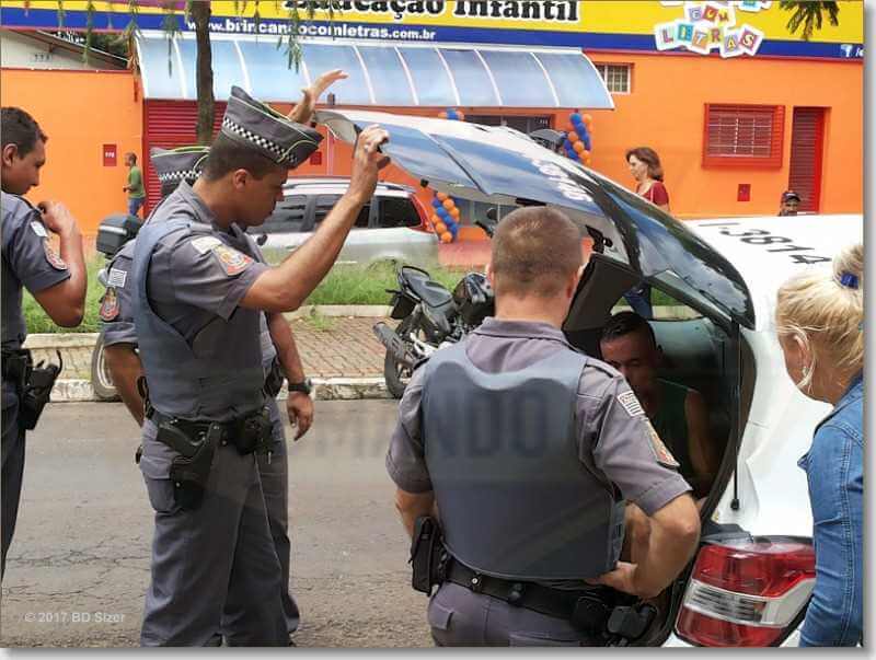 Segundo informação, a PM tinha conhecimento que um veículo Santana, placas anotas pelas vítimas, havia sido usado por assaltantes em um roubo a uma farmácia da Travessa Sete, região do bairro Redenção. Nesta tarde os policiais, sargento Camargo e soldado Alexandre estavam na Avenida São Carlos e avistaram o carro sendo conduzido por uma mulher e do lado do passageiro estava o marido da mesma e suspeito do assalto. Os policiais abordaram ao veículo e uma testemunha reconheceu o suspeito C.N.R.D, de 36 anos, como sendo o mesmo que praticou o assalto na farmácia. No local há câmeras de segurança e segundo a PM, este abordado aparece nas filmagens no dia do assalto. Ele foi encaminhado ao 2º D.P, qualificado e liberado.