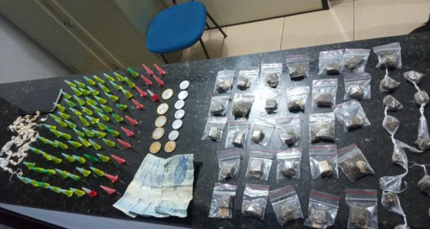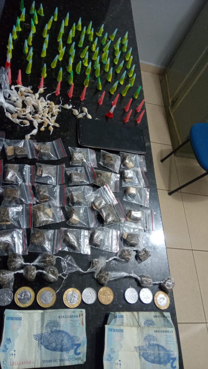 Segundo informações,  uma equipe  estava em patrulhamento preventivo, quando foi informada  pelo COPOM ( Centro de Operações da Polícia Militar) , que  na escadaria situada entre o campo de futebol e a escola SEMEI Professor  Maria Alice,  um indivíduo  estaria vendendo drogas. Em posse das características do indivíduo, os policiais foram  para o local e com a aproximação da equipe o indivíduo tentou fugir  a pé pelo campo de futebol.  Ele foi abordado e submetido a revista  pessoal, porém nada de ilícito foi localizado em seu poder.  No local onde  ele estava foi localizado uma sacola, contendo entorpecentes e dinheiro em espécie. Totalizando 83 pinos de cocaína (61 gramas), porções de maconha 84 unidades (41 gramas) e pedras de crack 73 ( 17 gramas ) e o valor de R$ 15,50 em dinheiro. Dado voz de prisão e conduzido ao Plantão Policial, onde foi autuado em flagrante por tráfico  de drogas e recolhido ao Centro de Triagem.