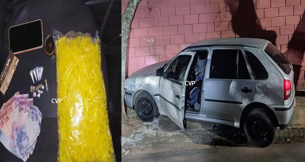 De acordo com boletim de ocorrência, policiais militares do Rádio Patrulhamento estava em patrulhamento ostensivo, quando um suspeito em um veículo Gol tentou fugir da viatura. Os policiais deram início ao acompanhamento, em determinado momento, o suspeito desceu do carro em movimento e correu para dentro de casa levando algo em uma das mãos. Ele adentrou ao banheiro e deu descarga. Como o veículo estava ligado, acabou batendo em um muro. Dentro do carro, foi encontrado 01 pacote contendo 1000 pinos vazios, que normalmente são usados para colocar drogas, 05 cheio de cocaína, 08 pedras de crack, 03 porções de maconha, 01 dichavador,R$ 151,00 e um aparelho celular.