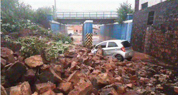 Um carro ficou danificado no final da tarde desta quinta-feira, 2 de janeiro de 2020, ao ser atingido por pedras e terra no Pontilhão VIII, da Vila Prado, São Carlos-SP.