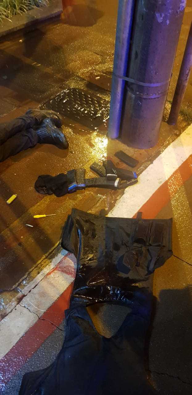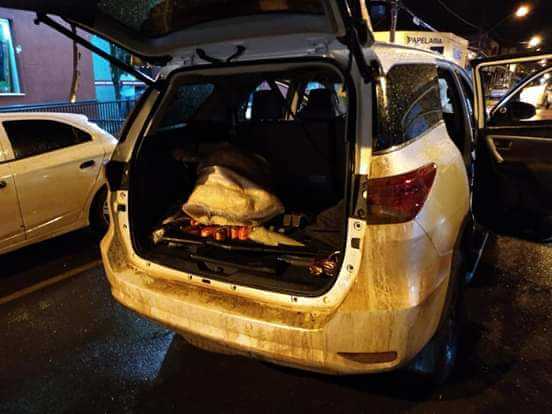 Amarok cinza. Tinha explosivos e uma arma. Encontrada próximo ao aeroporto.