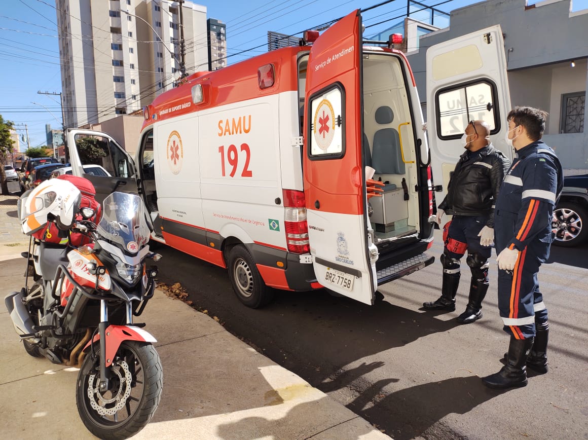 Um trabalhador foi socorrido pelo SAMU nesta manhã de segunda-feira, 14 de junho de 2021, após passar mal no trabalho e cair de uma escada na Rua Sete de Setembro, Centro de São Carlos-SP.