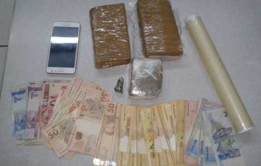 Os policiais realizaram a abordagem na moto e o rapaz de 27 anos se comportou de maneira suspeita. Dois tijolos de maconha foram localizados dentro de uma sacola escondidos em um capacete. Na carteira do rapaz, havia a quantia de R$ 572,00 reais. Em diligências a residência os PMs encontraram R$ 1.350,00 e uma trouxinha de maconha.