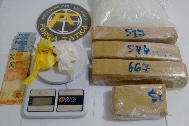 Um traficante de 34 anos foi preso pela Polícia Militar na tarde de segunda-feira (01-05-2017). Segundo informações, ele e sua namorada foram abordados pela equipe de Força Tática da PM quando transitavam pelo Jardim das Palmeiras. O casal estava em um automóvel Peugeot, placas de Leme. Em razão de serem conhecidos pelo envolvimento com o tráfico de drogas, bem como das informações desencontradas durante a abordagem, a equipe de Força Tática, comandada pelo Subtenente Vantin e composta pelo cabo Fernando e soldado Menezes, resolveu realizar uma vistoria na residência do casal localizada no Jardim Imperial II, local onde foram localizados os tijolos da droga, prensada totalizou 2.029 kg; 120 gramas de cocaína; 1.000 ‘pinos’ vazios para embalagem de drogas e uma balança de precisão. Também no imóvel, foram apreendidos 70 pacotes de cigarros contrabandeados.