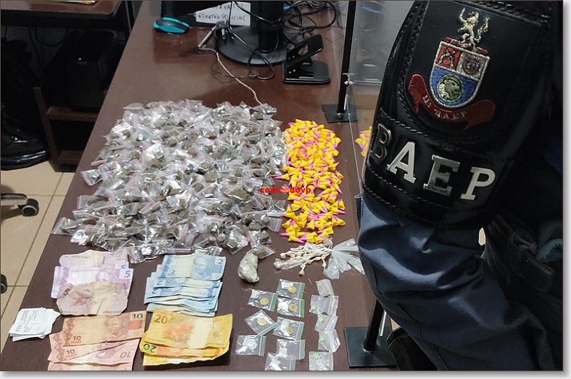 De acordo com fontes oficiais, os policiais estavam em patrulhamento preventivo pela zona sul desta comarca, quando avistaram dois indivíduos em um local conhecido como biqueira de drogas. Os suspeitos começaram caminhar depressa e, um dispensou algo ao solo. Eles foram abordados em com L. F.S.B, foram localizados dois pinos de cocaína e um cartão bancário. Já com A. H. R, foram localizados R$ 145,00 (cento e quarenta e cinco reais) e 05 (cinco) comprovantes de máquina de cartão de débito/crédito, no total de R$ 95,00 . Em buscas pelo local, foi localizada uma sacola contendo 295 porções de maconha, 01 – fração maconha, 175 pinos de cocaína, 33 – pedras de crack, 05 – ecstasy, 08 – Ice e R$ 145,00 reais em notas diversas. A ocorrência foi apresentada na Central de Polícia Judiciária, onde A. H. R, foi autuado em flagrante por tráfico de drogas e recolhido ao Centro de Triagem. O outro averiguado foi liberado, pois disse que estava no local somente para comprar drogas.