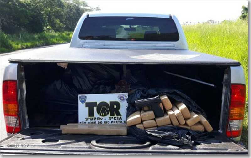 Os policiais então resolveram verificar o que ele carregava na caminhonete que lhe deixava apreensivo. Na caçamba e no  banco traseiro foram encontrados sacos pretos contendo 401 tijolos de maconha, bem como 14 pedaços da mesma droga. Dentro do carro, próximo dos pés do homem que disse ser vendedor, foi localizado uma pistola calibre 380, com numeração suprimida e  14 cartuchos. Alonso ao ser questionado sobre a droga e a arma ele disse que havia pego em Campo Grande e que as entregaria para uma pessoa em um posto de combustíveis em São Carlos/SP. Diante dos fatos o depoente deu voz de  prisão para Alonso e ele foi conduzido à delegacia.